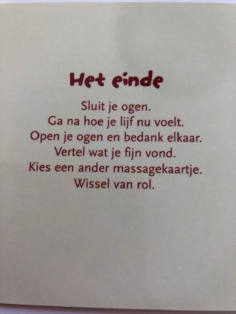- Ik heb een kaartje uitgekozen uit de kindermassagekaarten van Helen Purperhart. De massagegrepen die worden gebruikt: